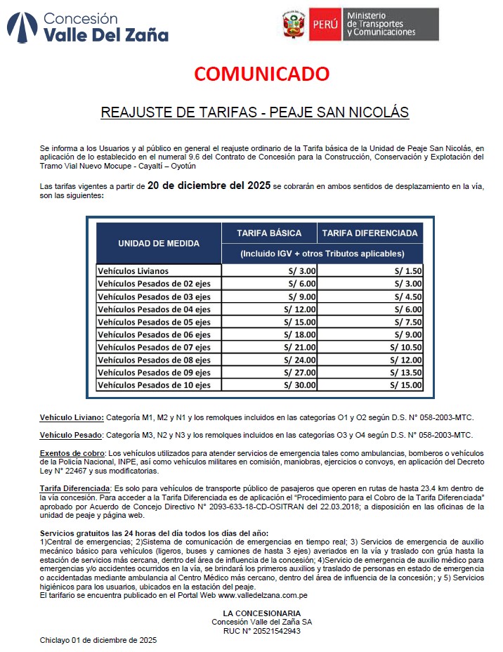 Se informa a los Usuarios y al público en general sobre el reajuste ordinario de la Tarifa Básica de la Unidad de Peaje San Nicolás, de acuerdo con lo establecido en el numeral 9.6 del Contrato de Concesión para la Construcción, Conservación y Explotación del Tramo Vial Nuevo Mocupe – Cayaltí – Oyotún.